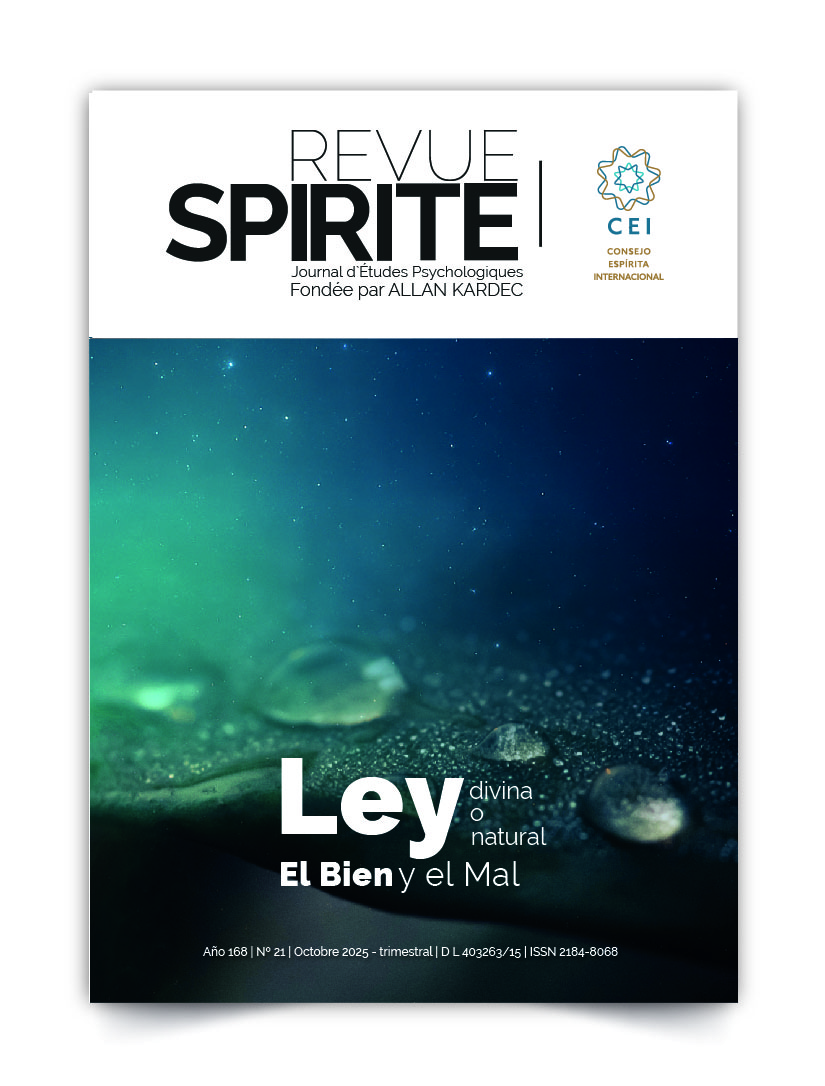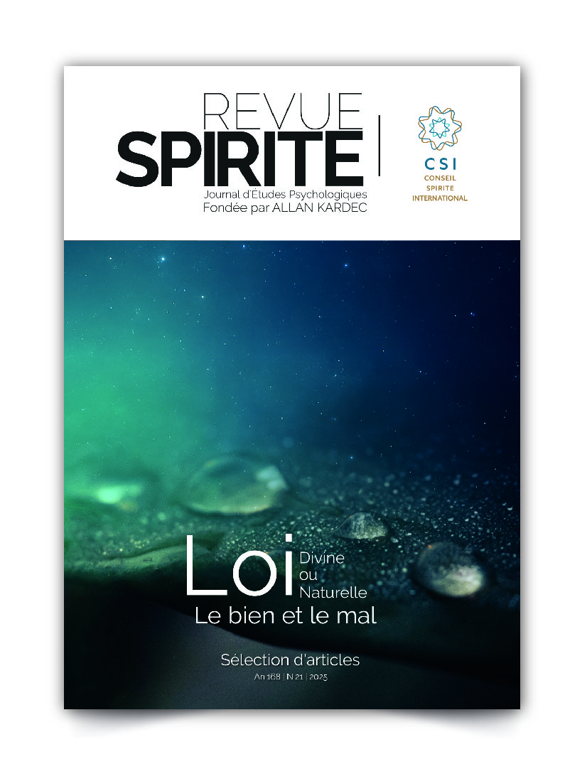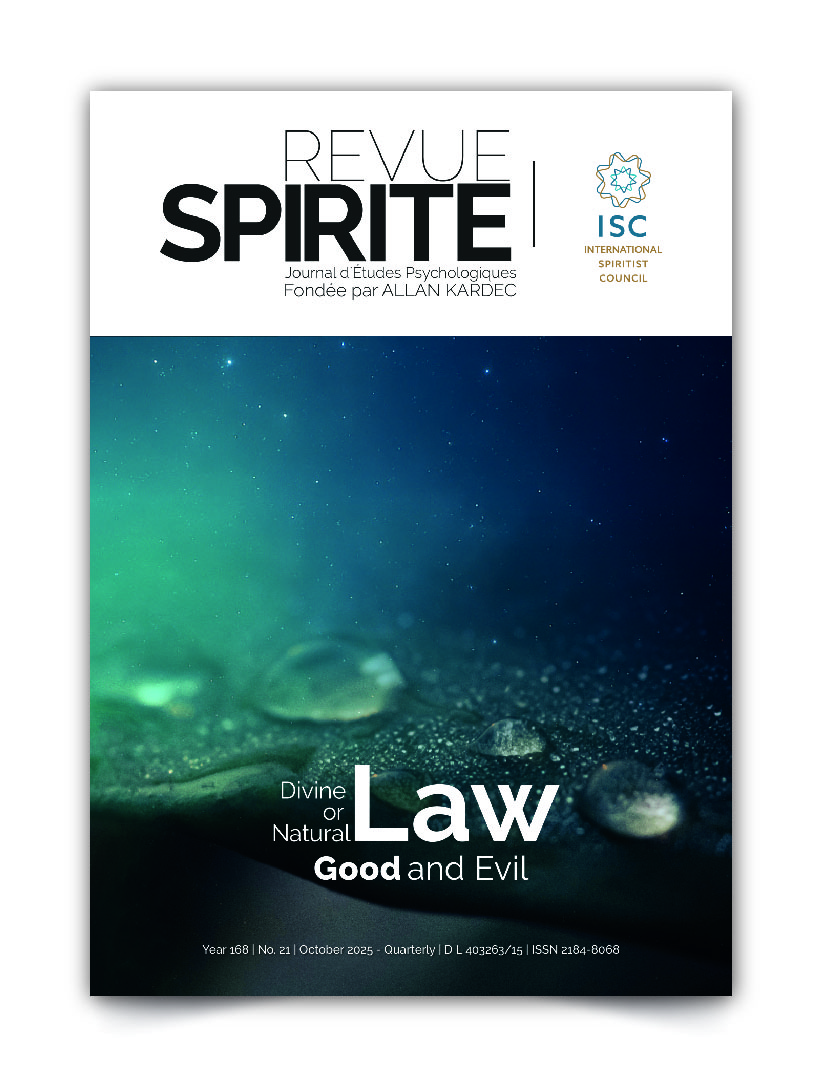 Iniciamos, com este número, o sexto ano de publicação da nova série da Revue Spirite. Com ele, abrimos um novo ciclo, convidando os nossos autores a orientar as suas reflexões para o conjunto das Leis Morais apresentadas pelos Espíritos superiores em O Livro dos Espíritos, obra fundadora do Espiritismo. Começamos por abordar a Lei Divina ou Natural, que rege tanto o universo material — objeto da ciência — como o universo moral, composto por leis que dizem respeito ao homem, à sua alma e às suas relações com Deus e com o próximo. Entre elas, deixamos algumas notas sobre o bem e o mal. Ao reunir estes estudos e reflexões, esperamos contribuir para o bem, “tendo em vista o bem e para o bem de todos”. Desejamos que seja útil!